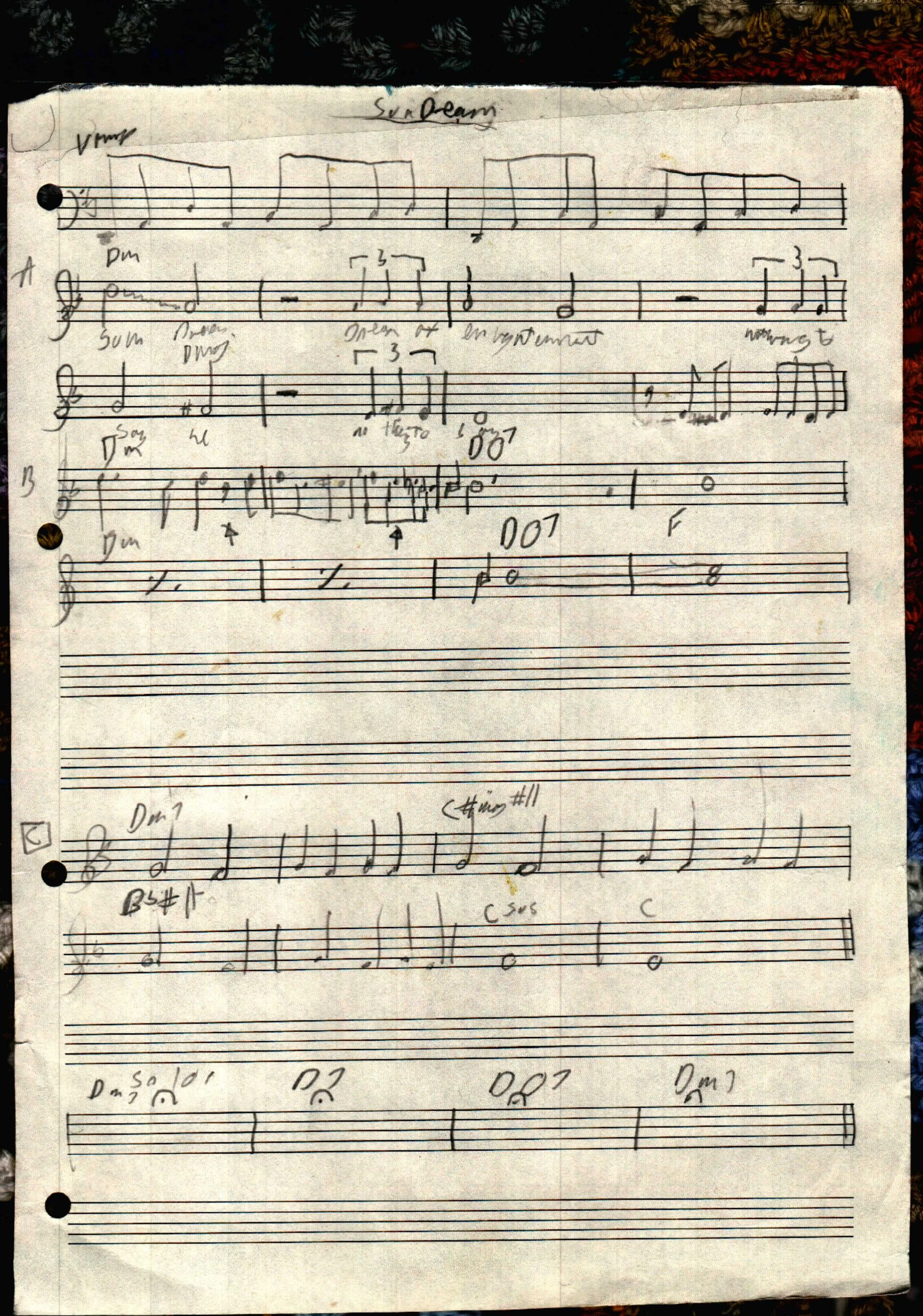 Original handwritten sheet music for ‘Sun Dream’, with a non-existent band in the B section. The C section features different chords to the final track.