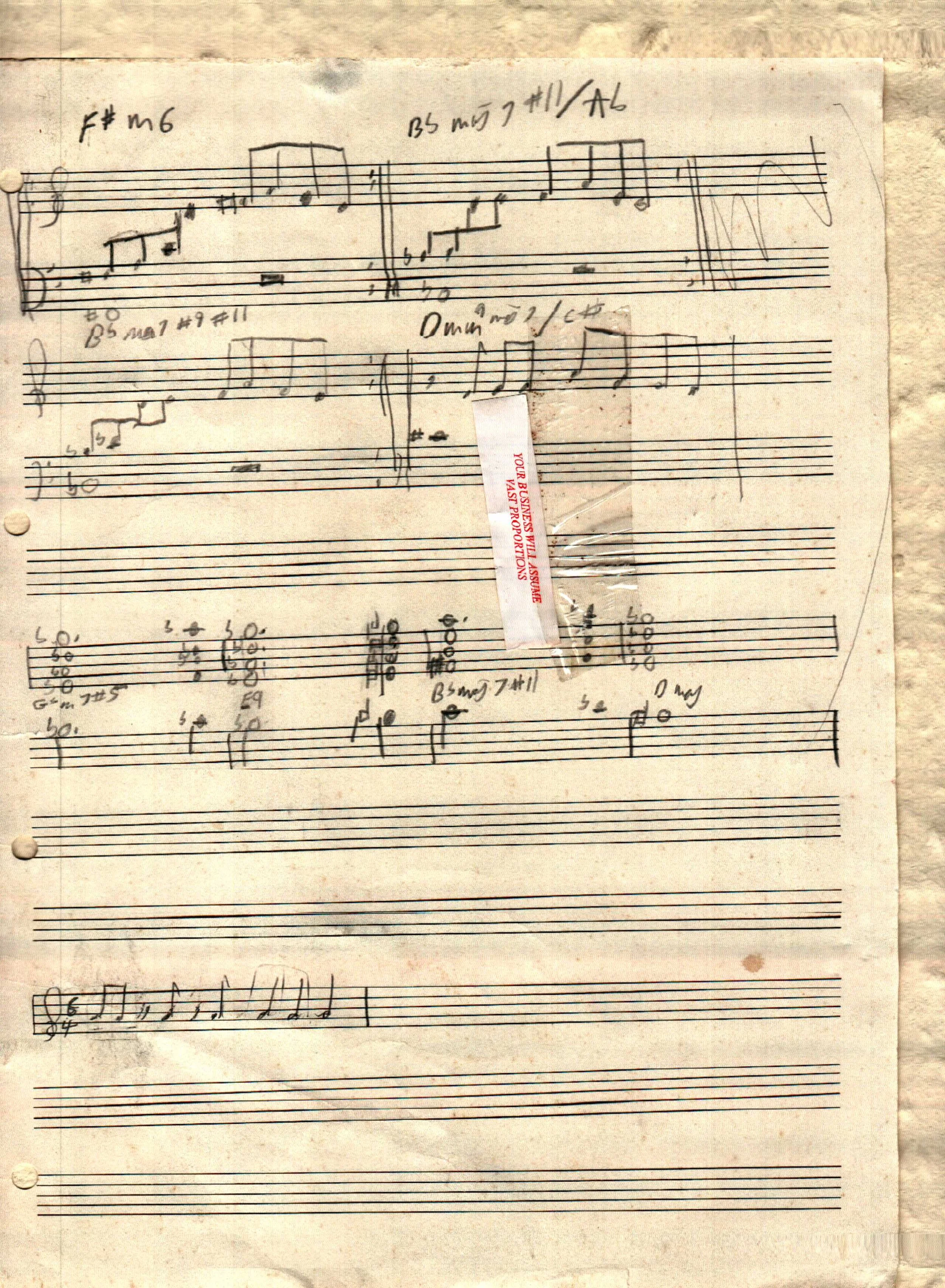 Unidentified handwritten score, with a business-related fortune cookie fortune incidentally taped on. Features a mis-transcribed West African bembe rhythm in the latter portion. Potentially an early draft of ‘Fuck The World Is On Fire’.