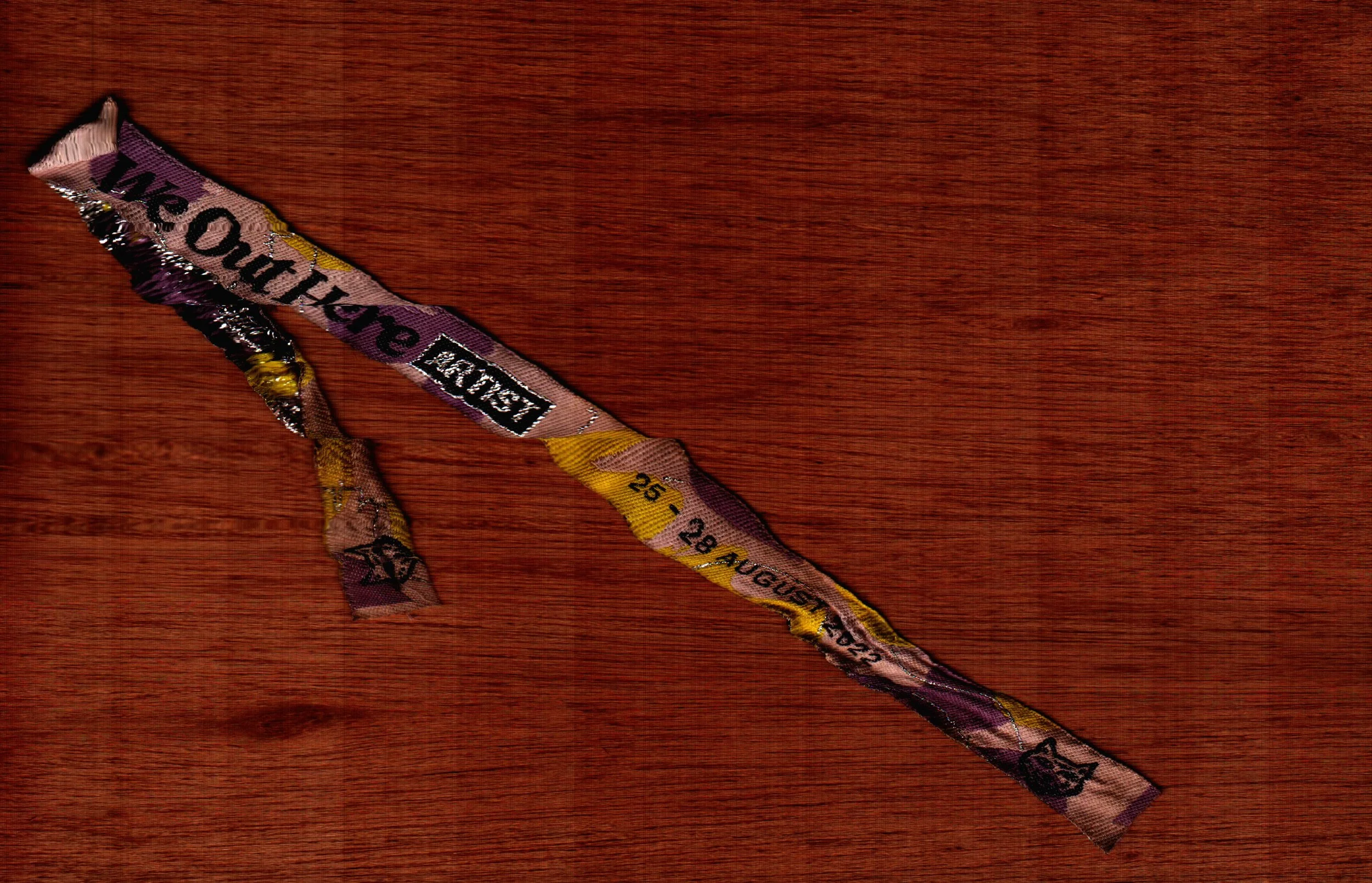 TCR/24/0014 MISC 28 Oct Written By Trash City Artist wristband for We Out Here festival, 2022. Played with NYJO (National Youth Jazz Orchestra). Date: 2022 Fergus Quillbackstage passwristbandWe Out HereDorset Trash City