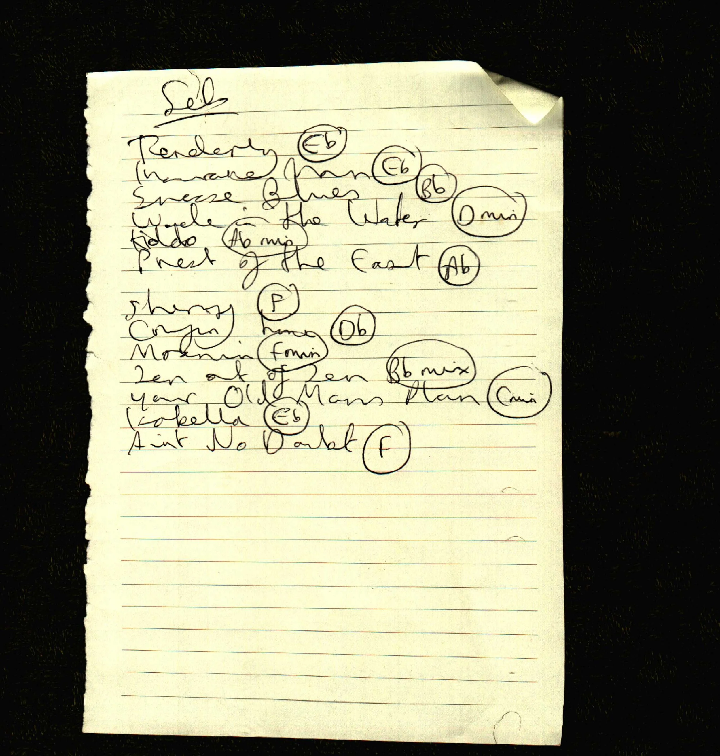 TCR/24/0027 MISC 24 Feb Written By Trash City Setlist from Olivia Cuttill Quintet’s launch for their debut album, ‘The Whole Damn Plan’. Date: 2023 Fergus QuillOlivia Cuttill Quintetsetlist Trash City