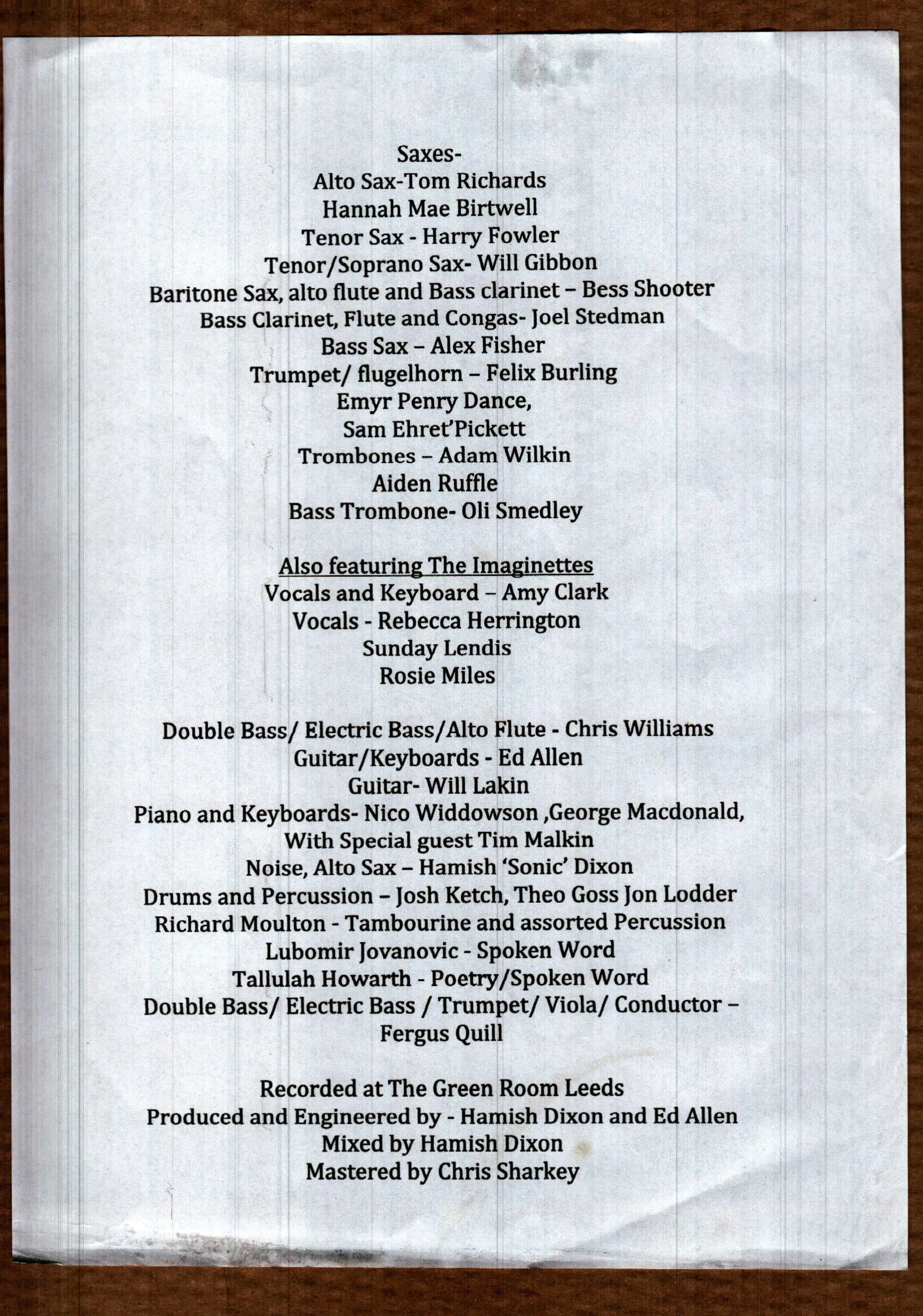 TCR/24/0029 MISC 24 Feb Written By Trash City Line up of first Ferg’s Imaginary Big Band album. Date: 2022? Fergus QuillFerg’s Imaginary Big Bandline upLeeds Trash City