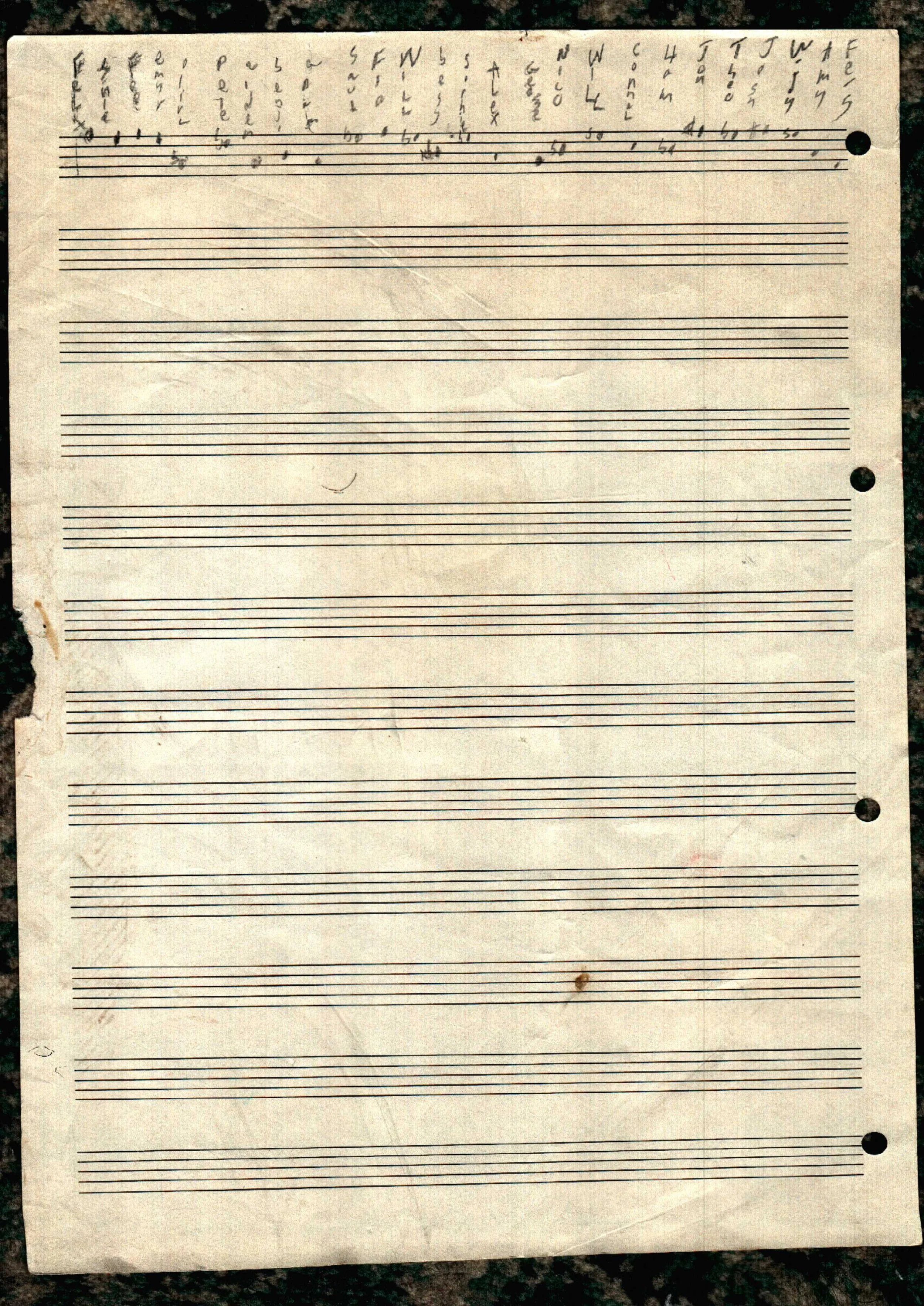 Handwritten sheet music for ‘Playing the Names’. This song was recorded for the second album by Ferg’s Imaginary Big Band. It is made up of transcribed names of each current member of the band into musical notation. The tune draws on tone rows and Ornette Coleman’s theory of harmolodics.